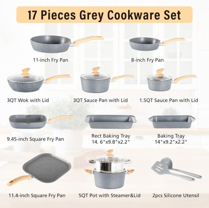 • 17 Piece Cookware Set: The pots and pans set includes 20cm fry pan, 28cm fry pan,16cm/1.5qt sauce pan with lid, 20cm/3.0qt sauce pan with lid, 24cm/5qt casserole with lid, 24cm/3qt wok with lid, 29cm square fry pan, 24cm square fry pan, 24cm steamer-5qt, Baking form 35.5*23.5*5.5cm, Rect.baking tray37x25x5.5cm, 2pcs silicone utensil. This pots and pans set includes everything you need to outfit a kitchen for your cooking.