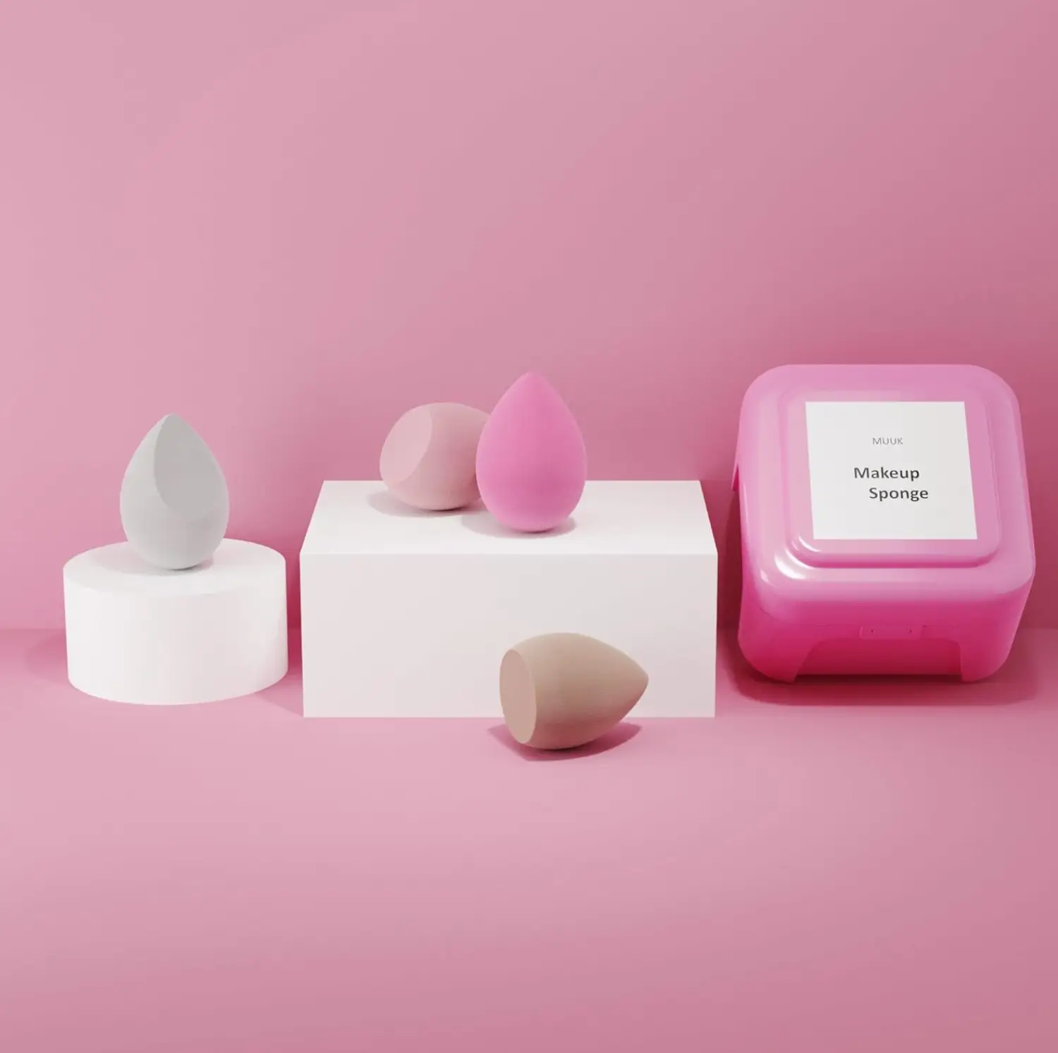 - Makeup sponge set of 4. This beauty sponge set includes 4 different shapes and colours of beauty blender applicators, including 2 slanted teardrops, 1 teardrop and 1 cut teardrop shape housed in their case.