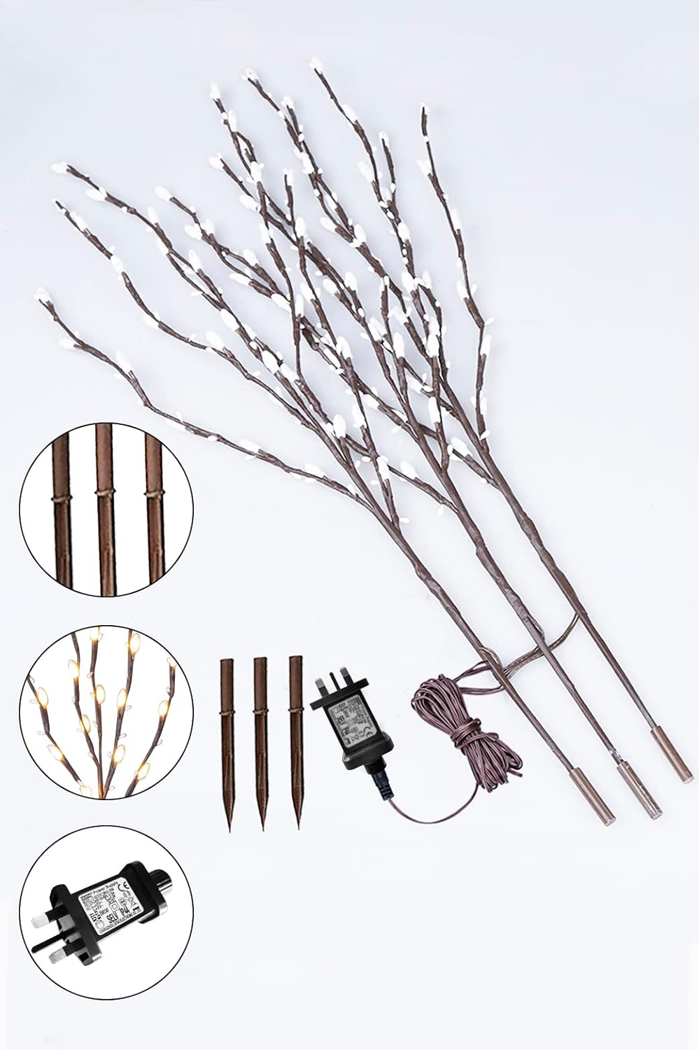• 【Lighted Twig Branches】: 3 pack branches dotted with 90 LED warm white lights, 35 inches wire connected, and 118 inches lead in with an adapter